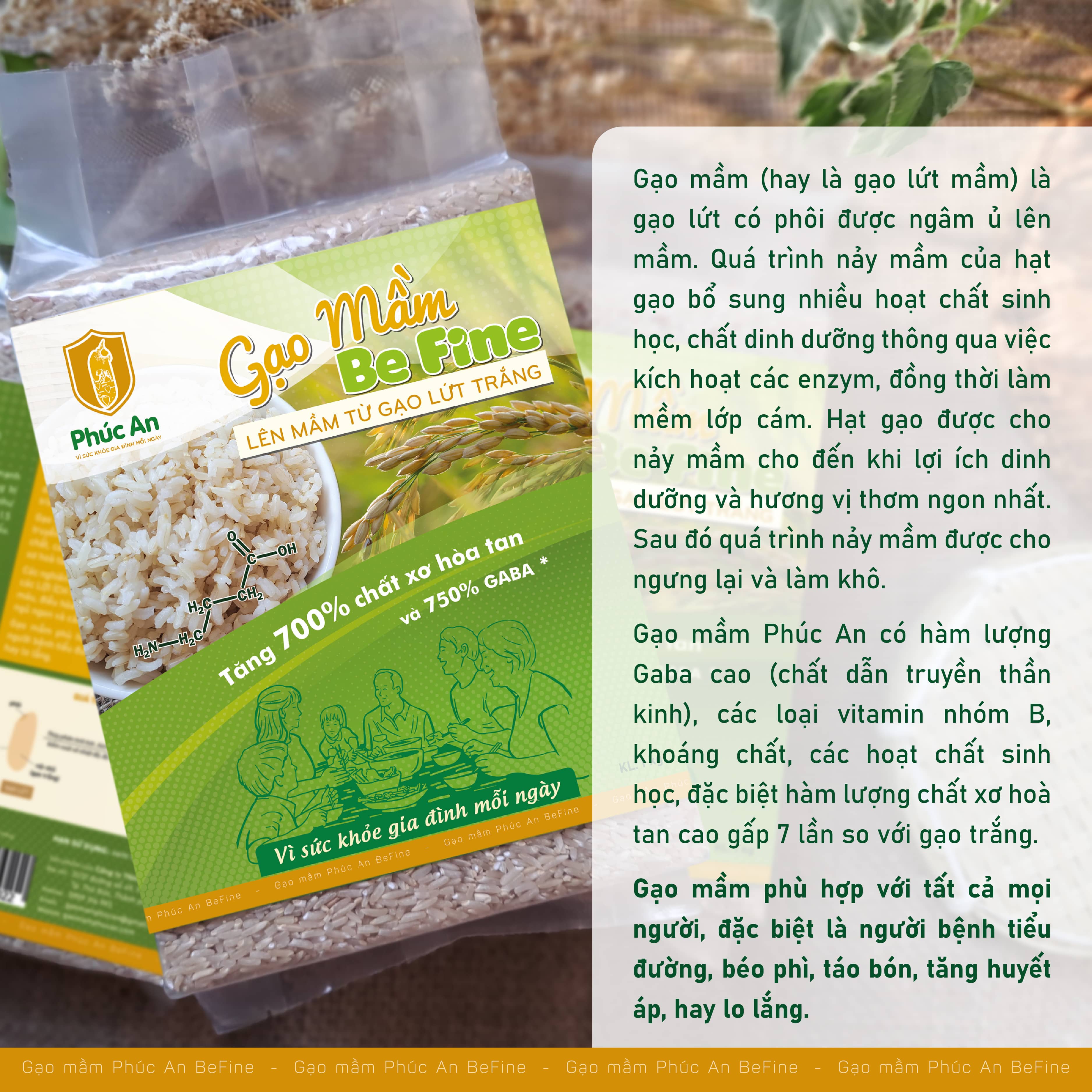 Gạo mầm Be Fine Phúc An có hàm lượng Gaba cao (chất dẫn truyền thần kinh), các loại vitamin nhóm B, khoáng chất, các hoạt chất sinh học, đặc biệt có hàm lượng chất xơ hòa tan cao gấp 7 lần so với gạo trắng.